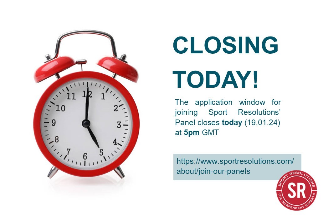 The application window for joining Sport Resolutions' Panel for the period April 2024 to March 2027 is closing today (19 January 2024) at 5pm GMT.